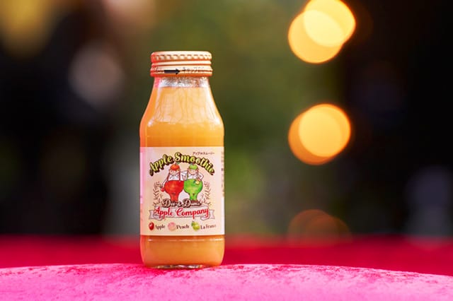 「青リンゴ好き」のディーと「赤リンゴ好き」のダムがどちらのりんごがおいしいか競って作った「アップルカンパニー」。りんご&もも& ラ・フランスをブレンドした果汁100%のスムージーをご賞味あれ。