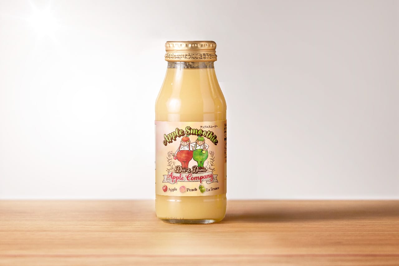 「アップルスムージー」「青りんご好き」のディーと「赤りんご好き」のダムがどちらのりんごがおいしいか競って作った「アップルカンパニー」。りんご&もも& ラ・フランスをブレンドした果汁100%のスムージーをご賞味あれ。
