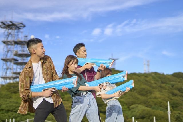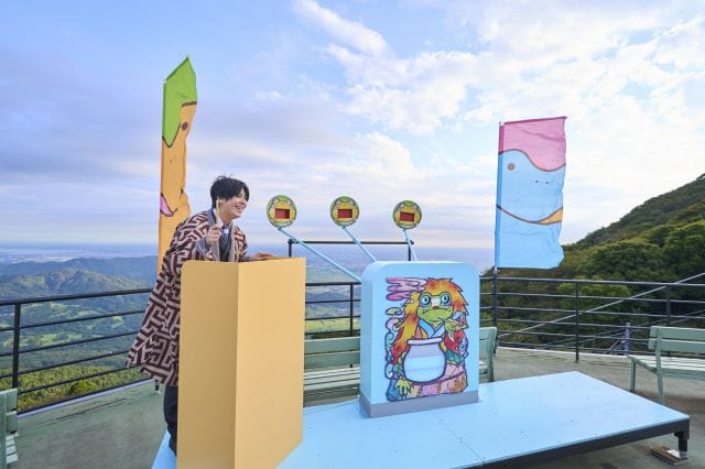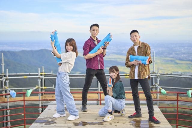スプラッシュ!!」がオープンいたします。「天空のガマスプラッシュ!!」は、眼下に広がる関東平野の大パノラマに浮かぶ『ミニガマ』をめがけ、4m以上の飛距離を持つ本格的なウォーターガンを発射させる爽快感がたまらない「山頂アクティビティー」。エリア内では、筑波山名物「ガマの油売りの口上」を現代風にアレンジした、通称『太鼓持ち(パフォーマー)』が登場。ユーモラスに目をぱちくりさせる『親分ガマ』と繰り広げる軽快なトークがノスタルジックな昭和レトロな世界を造り上げ、天空の射的体験をより一層盛り上げます。