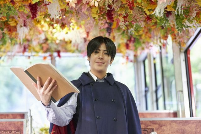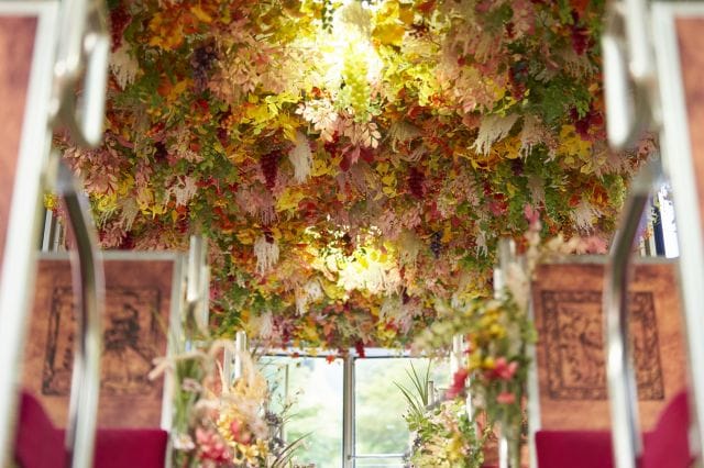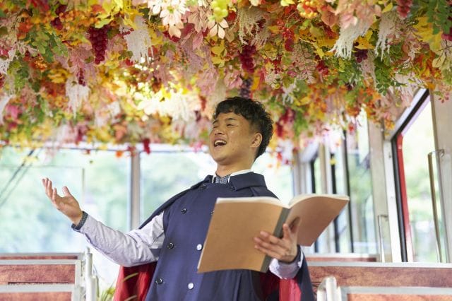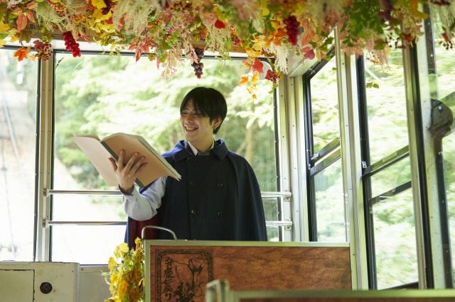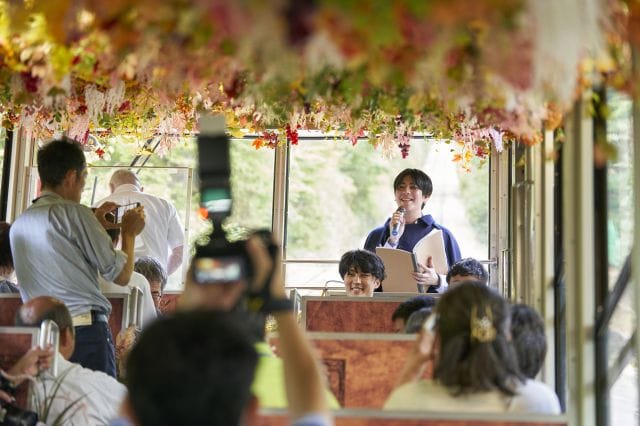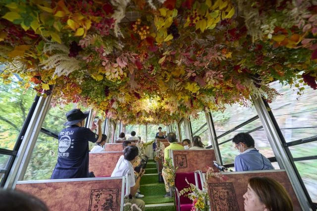 アートフラワーによる紅葉の装飾が秋の訪れを感じさせる車内では、山頂に到着する「8分間」の間、